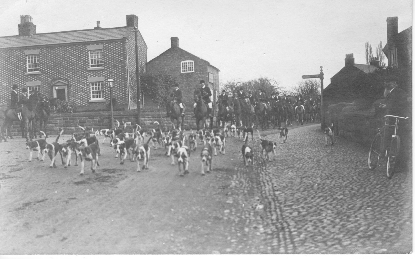 A further image which is of huge significance is of ‘The Hunt’ coming down Burwardsley Road onto the High Street (below). This postcard was actually posted in 1908 so we can presume that this image dates from 1908 or, in fact, earlier. The cobbles are long since gone, as is the street lamp outside of the former home of George Ashton (currently No 2 Rosebank). Note also the sign on the side of the building.