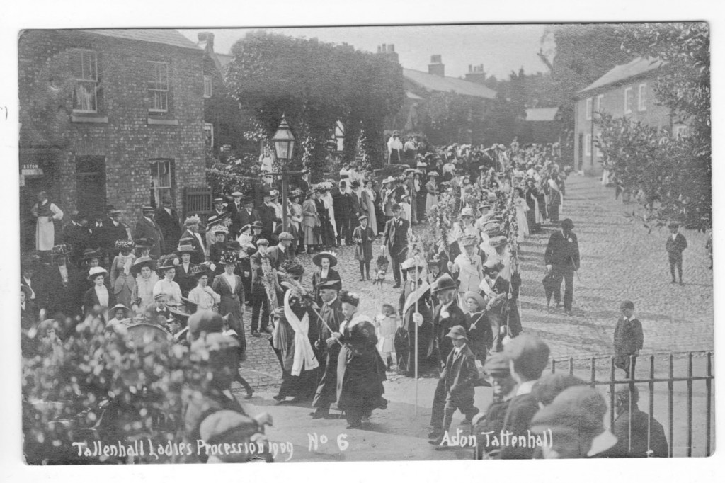 The postcard below is dated 1909 and is of a ‘Ladies Procession’, probably held during Wakes Weeks. A highlight of the year for many Cheshire villages, it was customary for each parish to hold their Wakes nearest to the date of their Patron Saint’s dedication – in the case of Tattenhall this would have been 22 June, the Feast Day of St Alban. The procession below is making its way down Church Bank and onto the High Street. Boys from the Tattenhall Home for Boys can be seen in the lower right hand corner of the image. They are wearing their caps and uniforms and they have a ‘grandstand’ view of the proceedings. Reverend Robert Welby Colston, who was Rector from 1903-1937, can be seen quite clearly at the front of the procession (following a brass band).