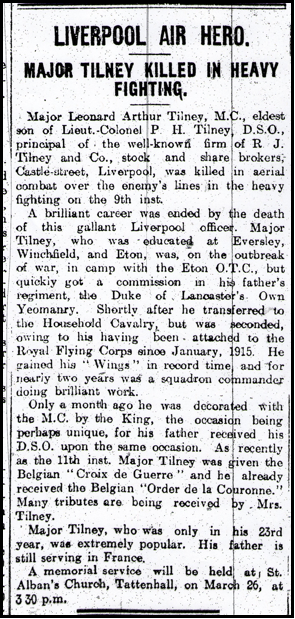A number of obituaries dedicated to Major Leonard Arthur Tilney appeared in the Liverpool press, not least because of his father’s connections with the well-known Liverpool firm of RJ Tilney and Company, Stocks and Shares Broker, Castle Street, Liverpool.
