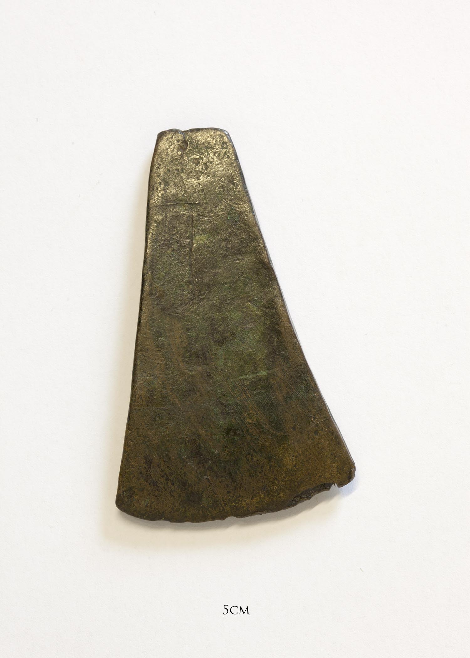 Found locally, a flat Axe Head of the early Bronze Age (c2500-1200BC), possibly composed predominantly of copper as the surface discolouration is principally blackish with small green patches. Much of the body is pitted and corroded, but a clearly discernible edge and a possible bulge at the midpoint make evident the former outline. The overall body shape is flared trapezoidal and lozenge-shaped when viewed from above. It is not symmetrical; the ‘upper’ flare is considerably larger than the lower one. No flanges are present.
