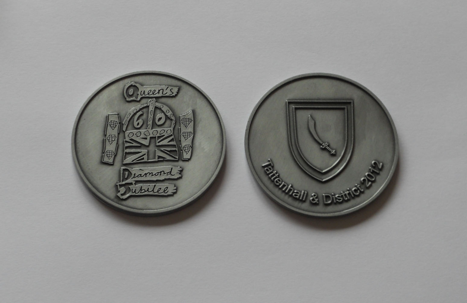 Whilst not quite an ‘Artefact’, it was felt appropriate to include an image of the ‘commemorative coin’ in this section of the Website.The Tattenhall and District Parish Council, together with the Bolesworth Estate, issued each child under the age of 16 and living within the Parish, a commemorative Jubilee Coin on the occasion of Her Majesty Queen Elizabeth II’s Diamond Jubilee, June 2012. Both sides of the coin are shown above and feature the official Diamond Jubilee logo as designed by Katherine Dewar and the ‘sword’ of the ‘Tatnalle Family’ from whom it is believed our village took its name (this sword is also featured on the Tattenhall Village Sign).