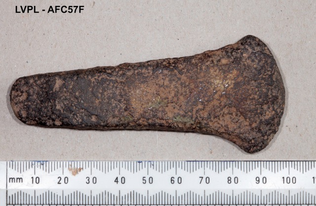 The above Flat Axe which dates from the Early Bronze Age (c2500-1500BC), is completely smooth and tapered at one end. It was found in 1938 by Dr TWL Moreton amongst a heap of bones at the Tattenhall Road Boneworks. The authenticity of provenance, therefore, is uncertain.