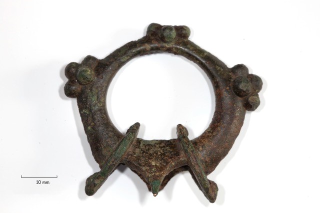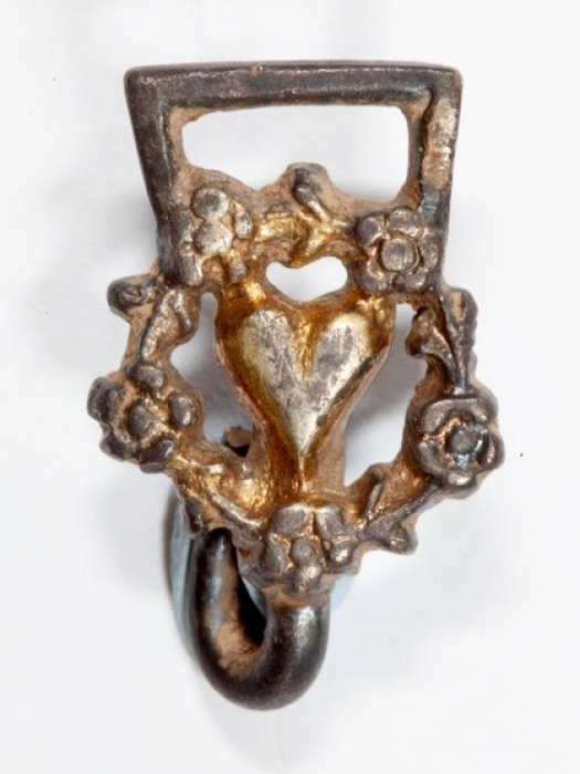 Found locally, a complete silver dress hook dated to the post-medieval period (c.AD 1450-1500). The object comprises ‘… openwork, moulded relief circular plate that is in the form of a love-heart in the centre which is surrounded by a floral wreath made up of five flowers, probably roses, spaced equidistantly apart with foliage between. A rectangular attachment loop extends from the upper edge of the wreath. Extending from the lower edge of the wreath is a circular sectioned hook with a pointed terminal curve …’. Hooks such as this were used to draw up skirts (either to keep them out of the muck of the street or to display the rich fabric of the garment beneath); to fasten garments, or for decoration.