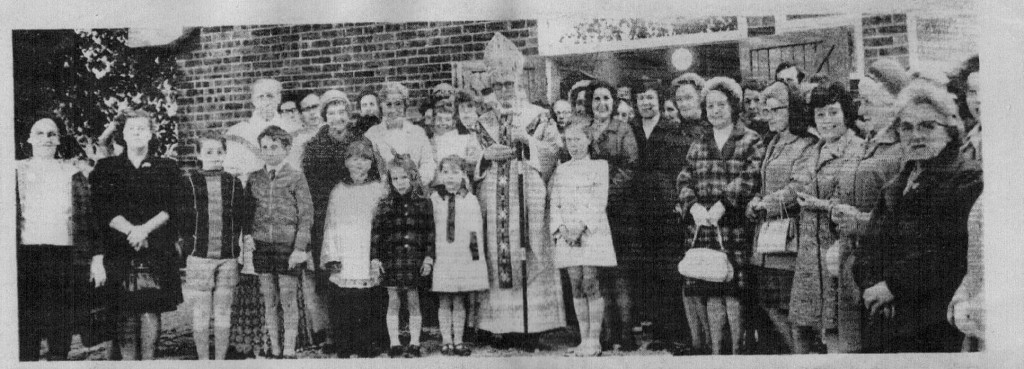 Historically, Catholics in Tattenhall and it’s immediate District attended Mass at the Righi which was a convent, a priest coming in from St Werburgh’s in Chester. Following the closure of the convent, Mass was celebrated in a hired room in the Bear and Ragged Staff public house. The Sacred Heart Fathers assumed responsibility for Tattenhall when they established themselves in Malpas. The building of a designated place of worship for Catholics was finally fulfilled with the building of ‘St Plegmund’s Roman Catholic Church’ at a cost of £5,000. The image below shows The Bishop of Shrewsbury, together with some of his parishioners, at the official opening.