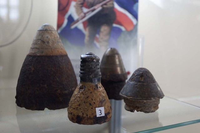 Artefacts Exhibition – various nose fuses/caps of different calibre (diameter) recovered from the Western Front. The pointed and curved ‘ogive-shaped’ nose gave the shells improved aerodynamic performance