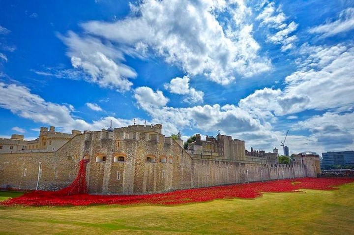 The Tower of London’s evolving installation, entitled ‘Blood Swept Lands and Seas of Red’. This artwork, created by ceramic artist Paul Cummins, will ultimately include 888,246 ceramic poppies which will progressively fill the Tower of London’s famous moat