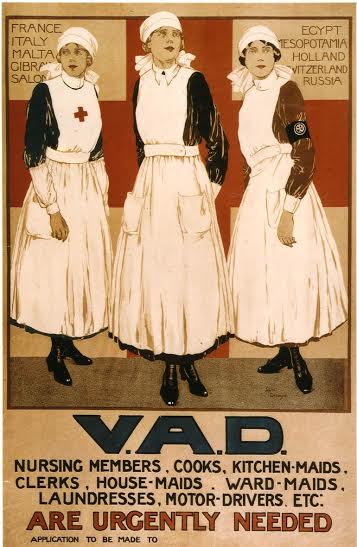 The authentic reconstruction of our Auxiliary Military Hospital Ward was based on surviving photographs and paintings of the interior of the Barbour Institute; documents held at the Imperial War Museum relating to Edith Marguerite Wignall (who was ‘Commandant’ of both the Auxiliary Military Hospital based in the Barbour Institute and that based in the Annexe of her own home, ‘The Rookery’); Frederick Cayley Robinson’s iconic painting (below) and the famous VAD poster (also shown below). The painting and poster are included separately and credited as shown – my thanks to both the Wellcome Library and to the British Red Cross Museum and Archive for supporting our centennial event.
