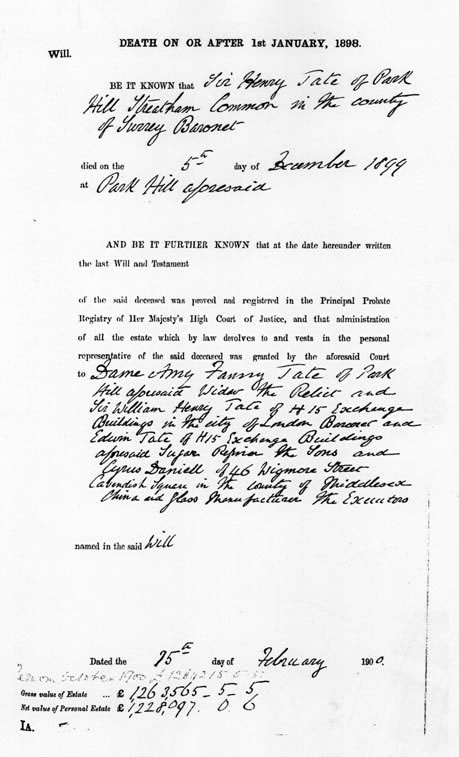Edith’s family was extremely wealthy and upon the death of Henry Tate on 5 December 1899, the Gross Value of the Estate was just short of £1.3m.